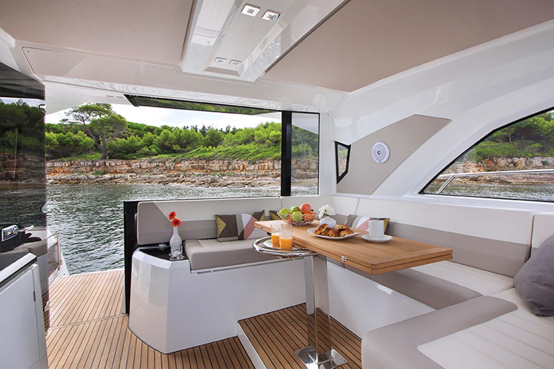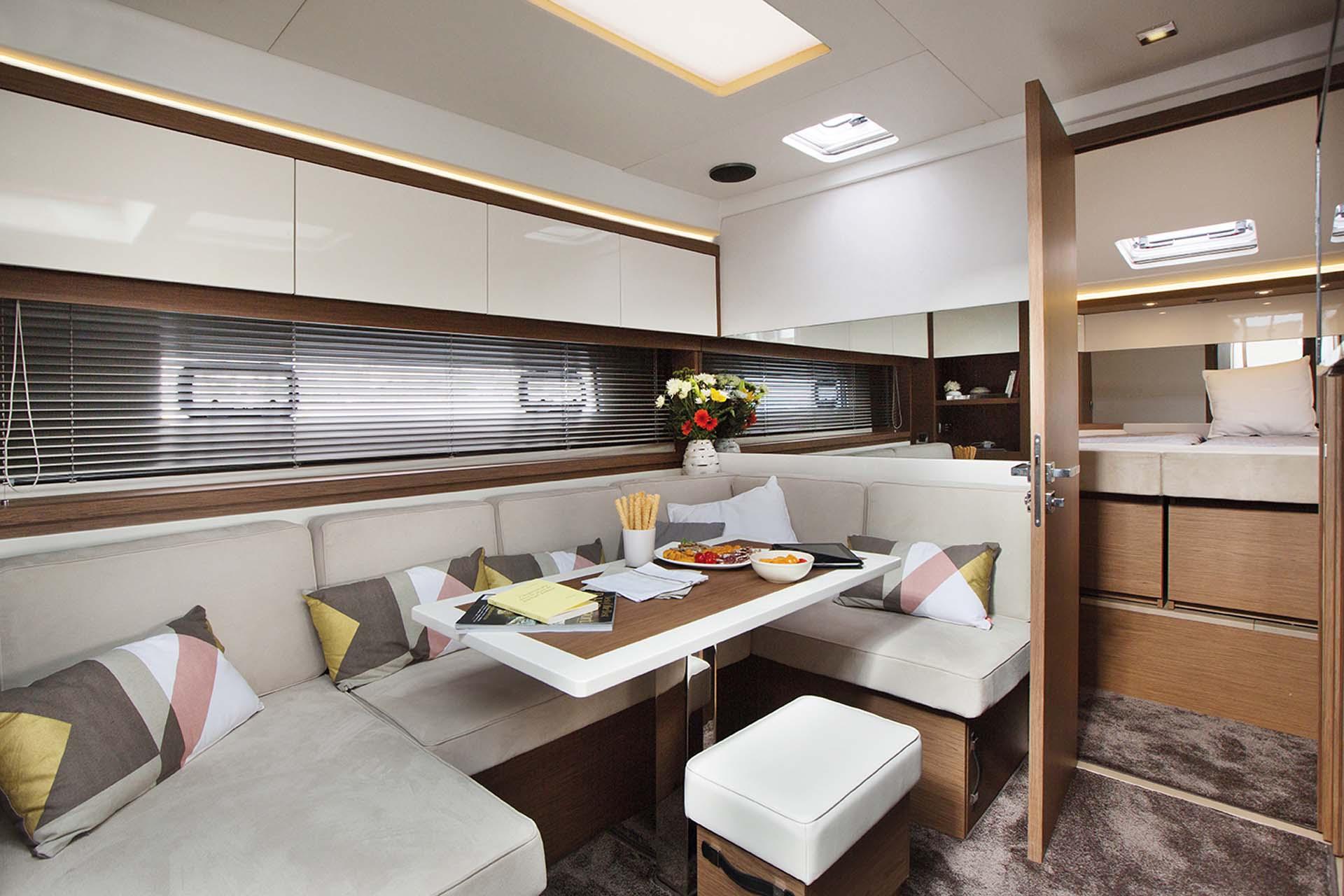 This Jeanneau boat features plenty of space to unwind and soak up the Mediterranean sun. A nice sunbathing area is located at the rear of the boat. This space converts into a dining area with a table and a sofa on each side. A few steps forward and the cockpit doors open to a lovely seating/dining area. The foredeck offers a double sun pad.