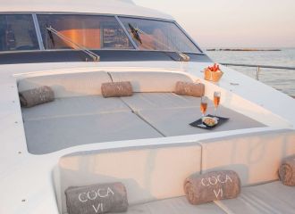 The yacht provides plenty of options for dining on deck, unwinding or enjoying the Mediterranean sunshine. On the main deck aft, charter guests will find a lovely alfresco dining area. The foredeck, accessible from both sides of the yacht, features a double sun pad and a seating area. This is a great place to enjoy delicious cocktails during your Mediterranean yacht charter. Up on the flybridge, there is an additional dining table as well as a lounge, a bar, a jacuzzi and a sunbathing area.
